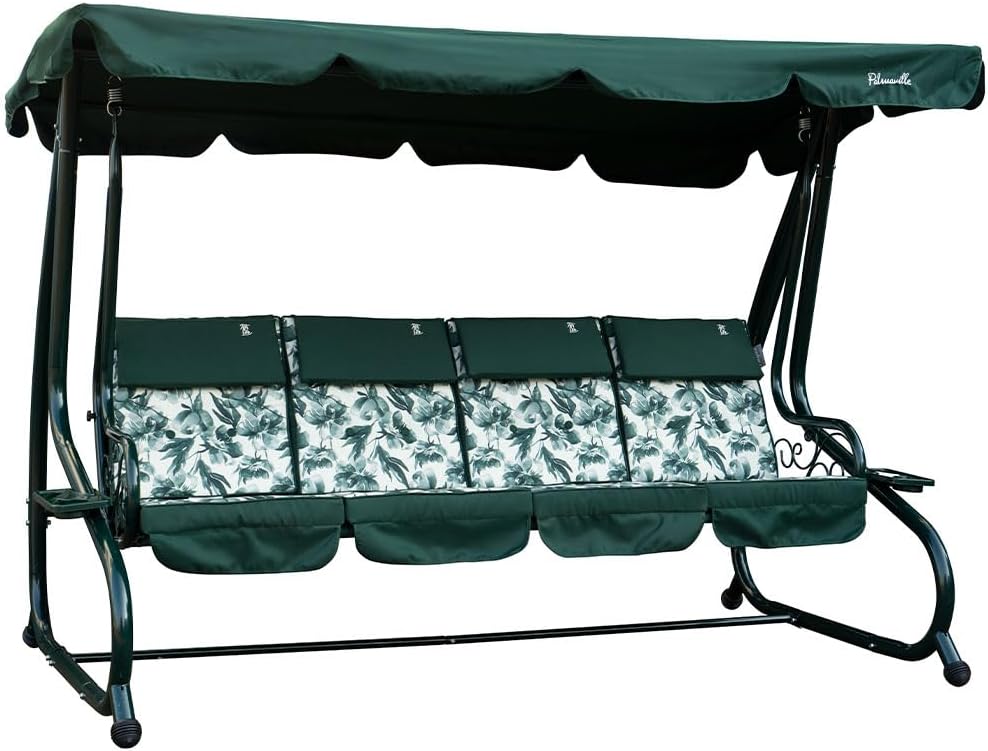 Balancelle de jardin avec fonction inclinable en lit avec toit réglable, coussins rembourrés de 7 cm avec appui-tête amovibles et structure en acier peint Mizar vert bégonia, 4 places