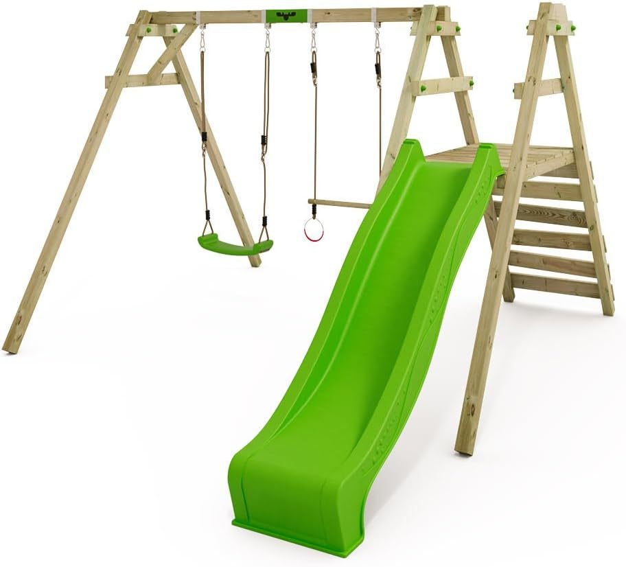 FATMOOSE Portique de Balançoire JollyJack - Double Avec Toboggan Vert Pomme et Annexe à Grimper, en Bois Pour Enfants Dans Le Jardin