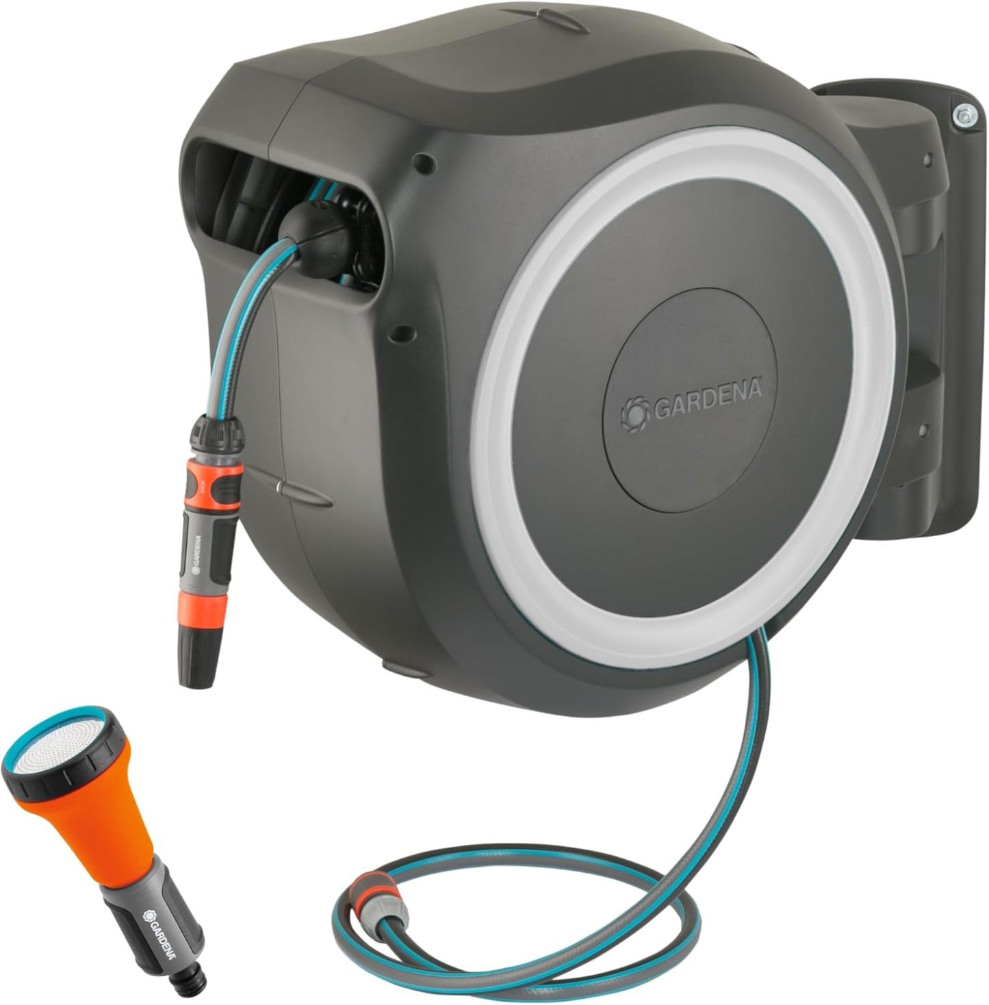 Gardena Dévidoir mural enroulable M/L Blanc 25 m : système d'arrosage polyvalent pour jardin de taille moyenne à grande, dévidoir de tuyau pivotant, avec tuyau Gardena de 25 m et kit de montage