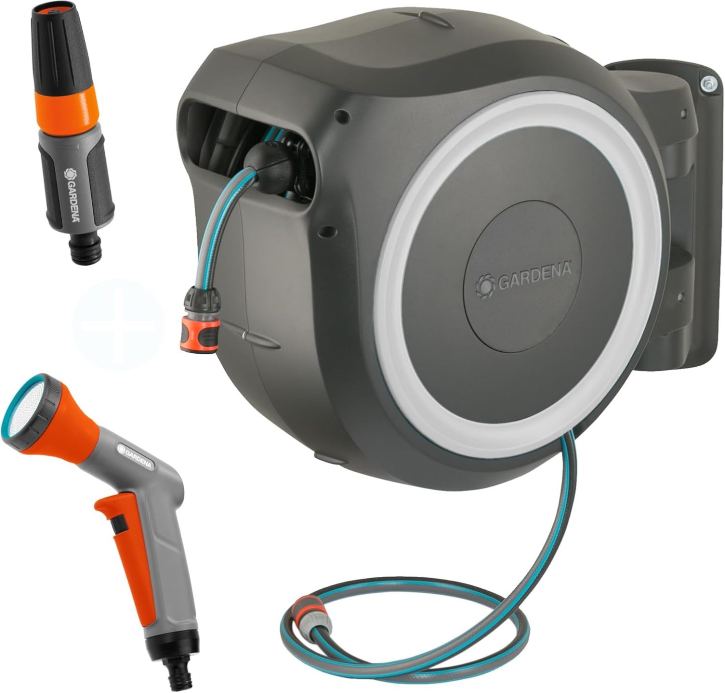 Gardena RollUp XL 35m: Solution d'arrosage flexible pour grands jardins avec coffre mural pivotant, incluantun tuyau de qualité Gardena de 35m et une douchette de jardin Classic 18632-60, 18312-33